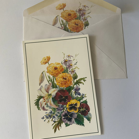 Pretty flowers blank greeting card with matching envelope, pansys, lilys and flowers for gifts, scrapbooking, collage