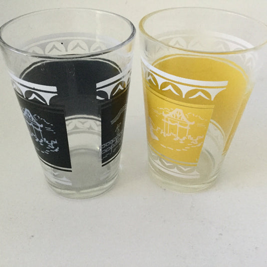 Two drinking glasses with Chinese pagoda and garden scene - small decorative glasses, mid century