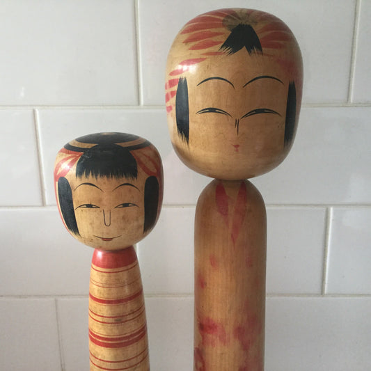 Two large Japanese Kokeshi dolls - traditional designs, signed on bottom, Japan, home decor, Togatta style