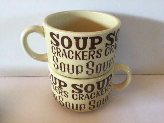 2 Large stoneware soup and crackers mugs in cream and brown, 1970's classic style