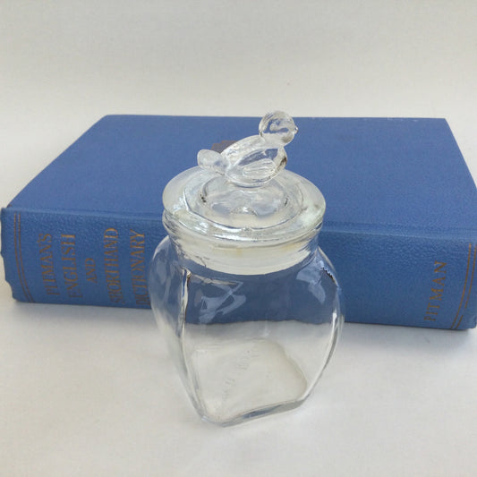 Glass jar with tiny bird on the lid - cute small seventies storage jar, dresser accessory, make up, container