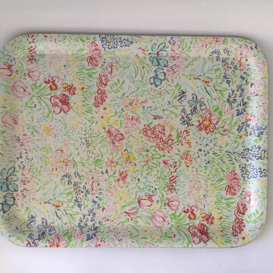 Floral design serving tray with squiggly colourful flowers in Ken Done style - eighties solid plastic tray