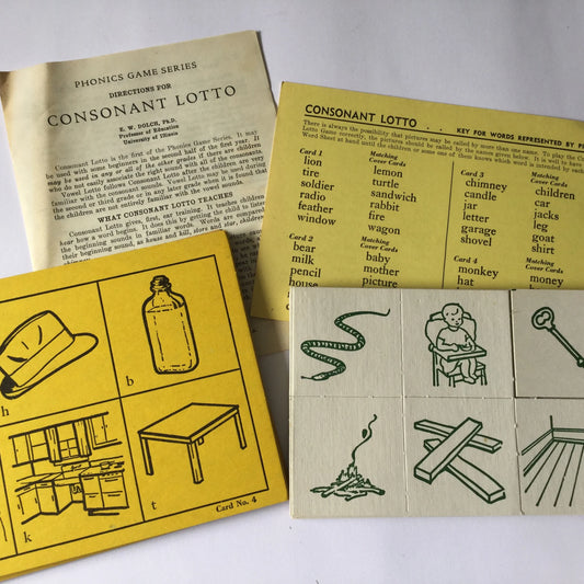 1950's vintage Consonant Lotto Phonics Game by Dolch - mid century, educational graphics, phonics, game