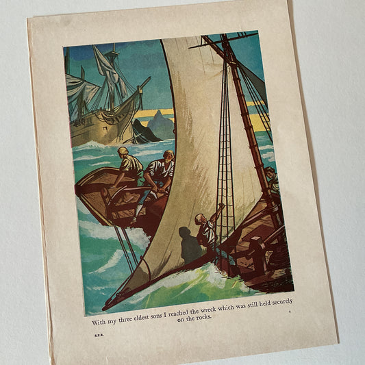 Two schoolboy annual book prints - The monkeys screamed, I reached the wreck - vintage paper for journal, collage, framing