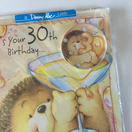 Vintage Greeting card - It's your 30th Birthday... cute hedgehog and cocktail with badge - 1980s birthday card