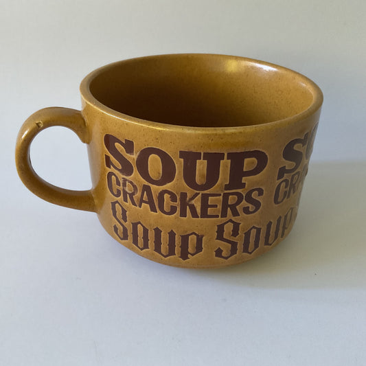 Large stoneware soup and crackers mug in brown and tan, 1970's classic style