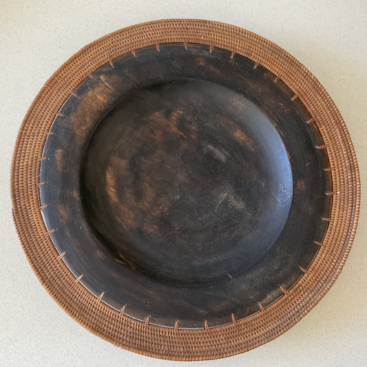 Very large carved wood plate with rattan woven edge - unique decor, coffee table hold all, rustic or tropical style