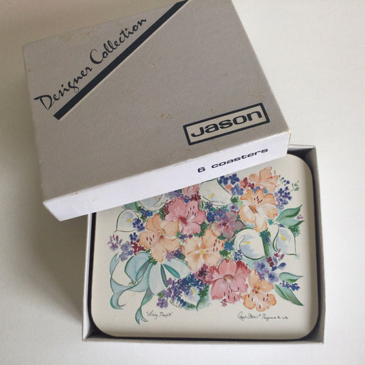 1980’s pretty flower decorative drink coasters - Loving Thoughts by Augie Strauss - original Jason Designer Collection box