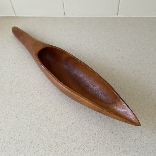 Long carved wooden bowl, narrow boat design made from monkey pod wood - unique decor, coffee table hold all, rustic or tropical style