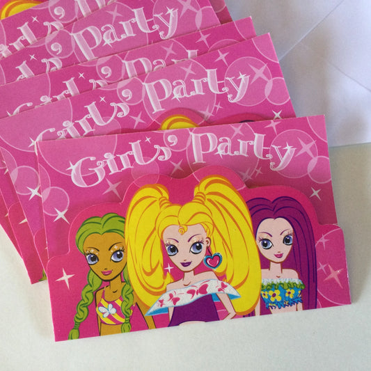 Girl party invitations with envelopes - 6 retro Bratz or girl power birthday party cards, pink glitter fun