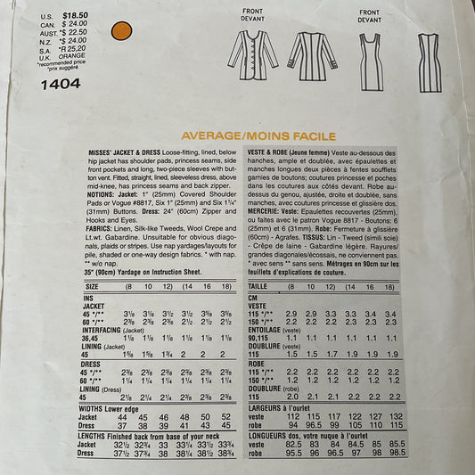 Vintage 90s Vogue American Designer 1404 - Oscar de la Renta - Misses’ long jacket and dress complete original sewing pattern