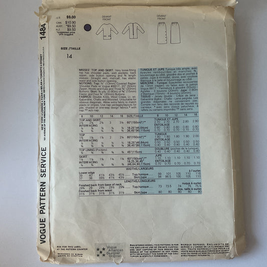 Bill Blass vintage Vogue sewing pattern 1980s Vogue American Designer 1484 - Misses’ Top and skirt Uncut and complete Size 14