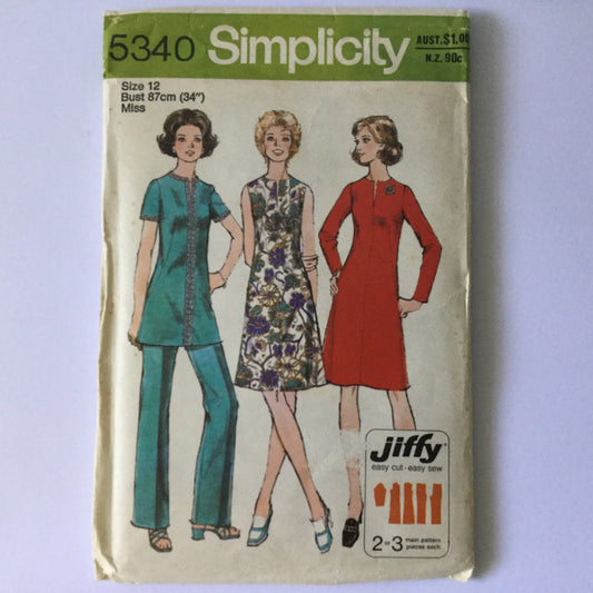 1970s pattern Jiffy Dress or Tunic, vintage Simplicity sewing pattern - Simplicity 5340 Size 12 - unused and complete