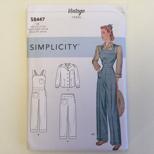 1940's vintage style pants, overalls and blouse pattern Simplicity S8447 - Sizes US 16-24 - Unused, uncut and factory folded pattern
