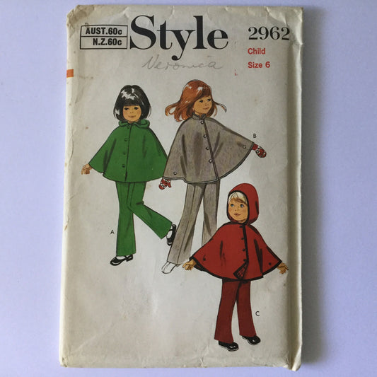 Child's Cape and trousers, 1970s sewing pattern - Style 2962, Size 6 - unused and complete