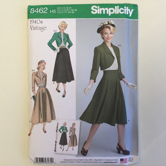 1940's vintage style blouse, skirt and bolero jacket pattern Simplicity 8462 - Sizes US 6-14 - Unused, uncut factory folded pattern forties