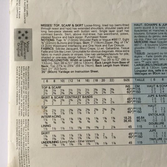 Vintage 80s Vogue American Designer 2187 - Albert Nipon - Misses’ Top, Scarf, uncut and complete original sewing pattern