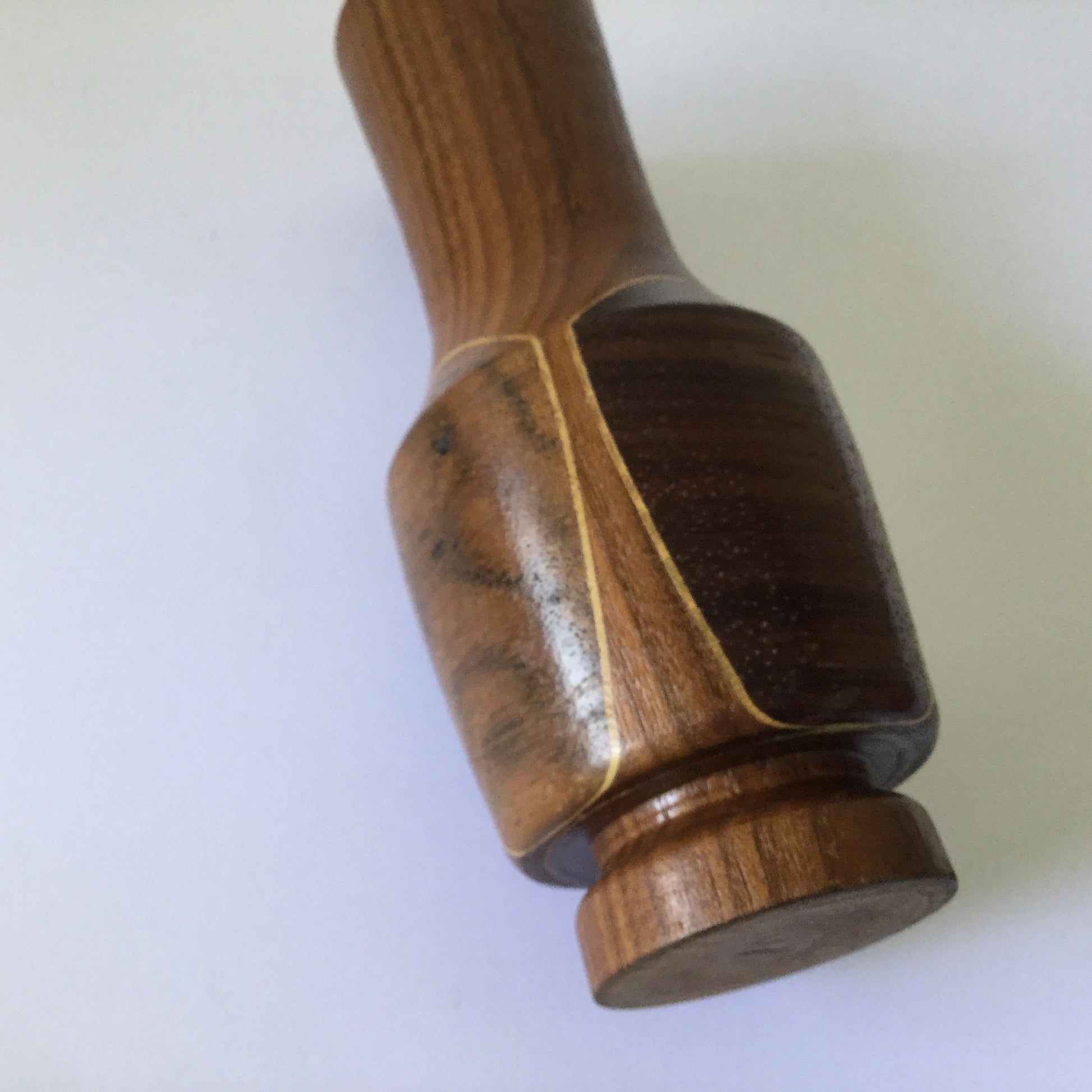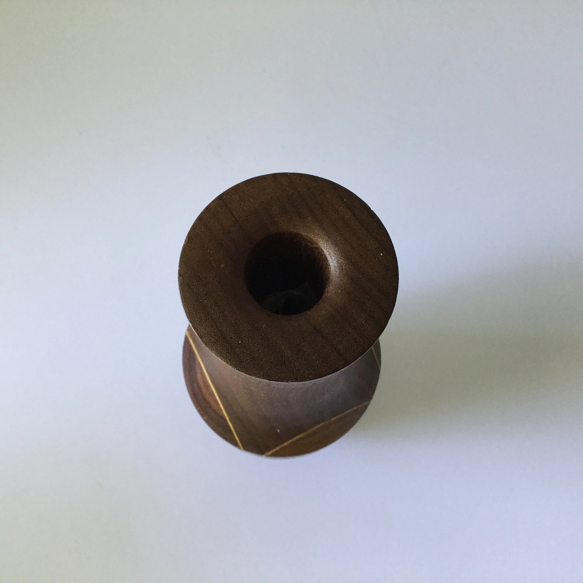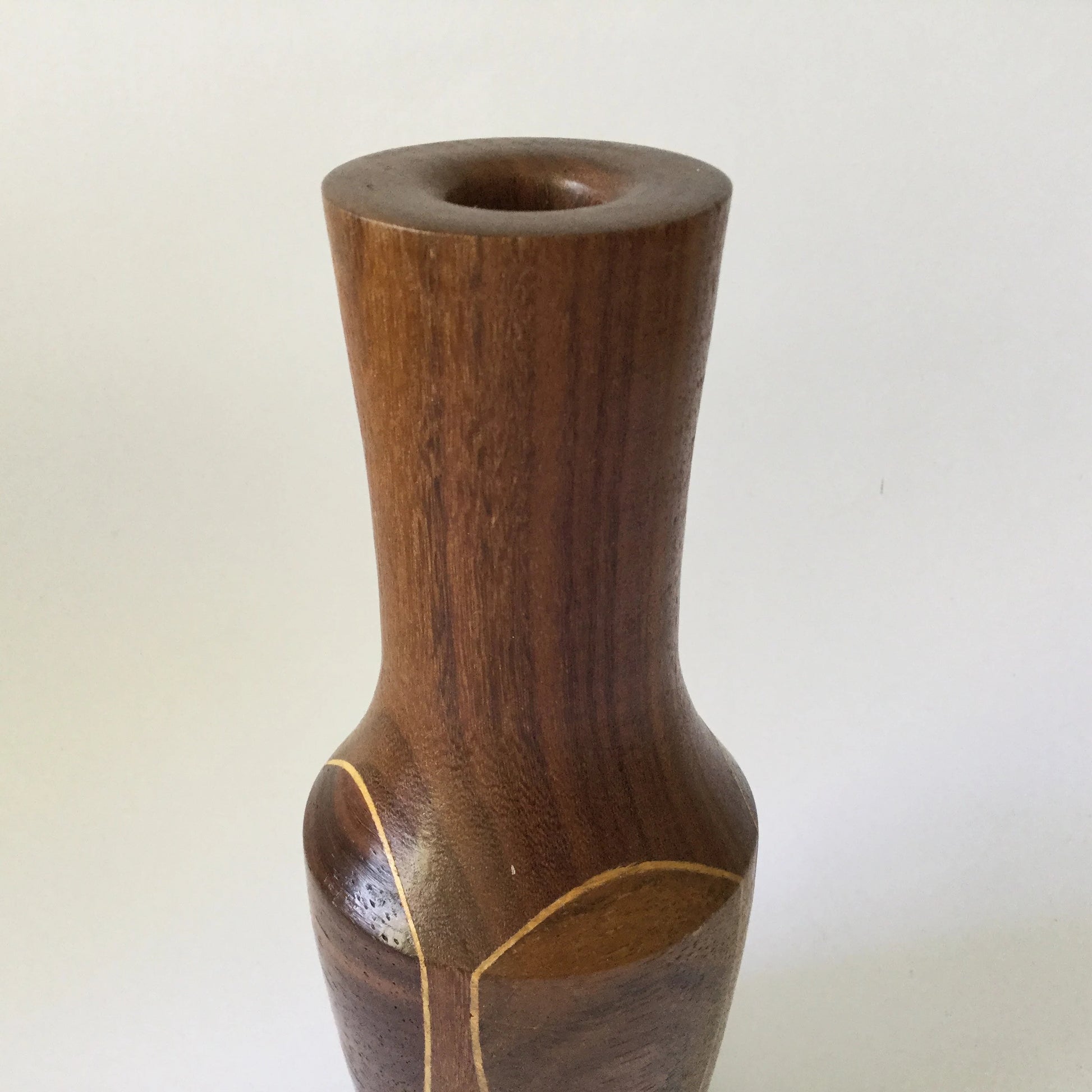Hand made wooden vase with a central flute that allows a dried flower or branch to be held. Could also hold a slim candle. A mix of different woods have been inlayed into the turned wood piece for added for texture and design. The finished look fits a scandi or mid century modern decor.